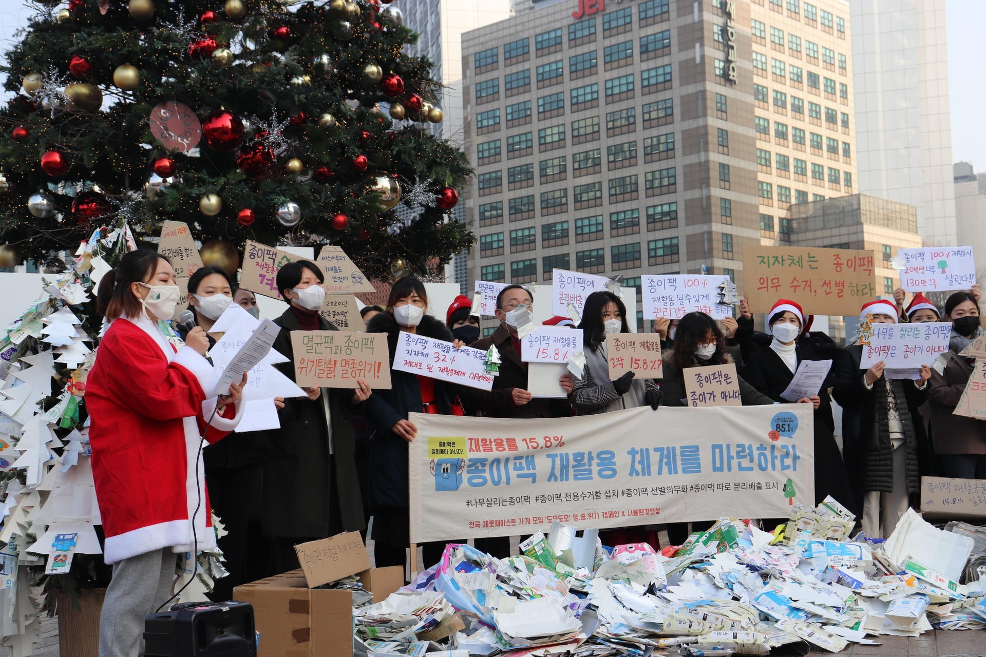 2024년에는 시민사회와 함께 종이팩 재활용률을 제고하기 위해 ▲분리수거 지침 개정을 통한 종이팩 별도 수거 품목 지정 ▲지자체 정부합동평가 지표 개선 등 지자체 역할 강화 ▲소비자 혼란을 초래하는 멸균팩 ‘재활용 어려움’ 표시 개선 ▲공공기관의 녹색제품 의무구매 관리감독 강화 등 정책 제안을 발표하고, 기후에너지환경부(이하 환경부)에 이행을 촉구했다.